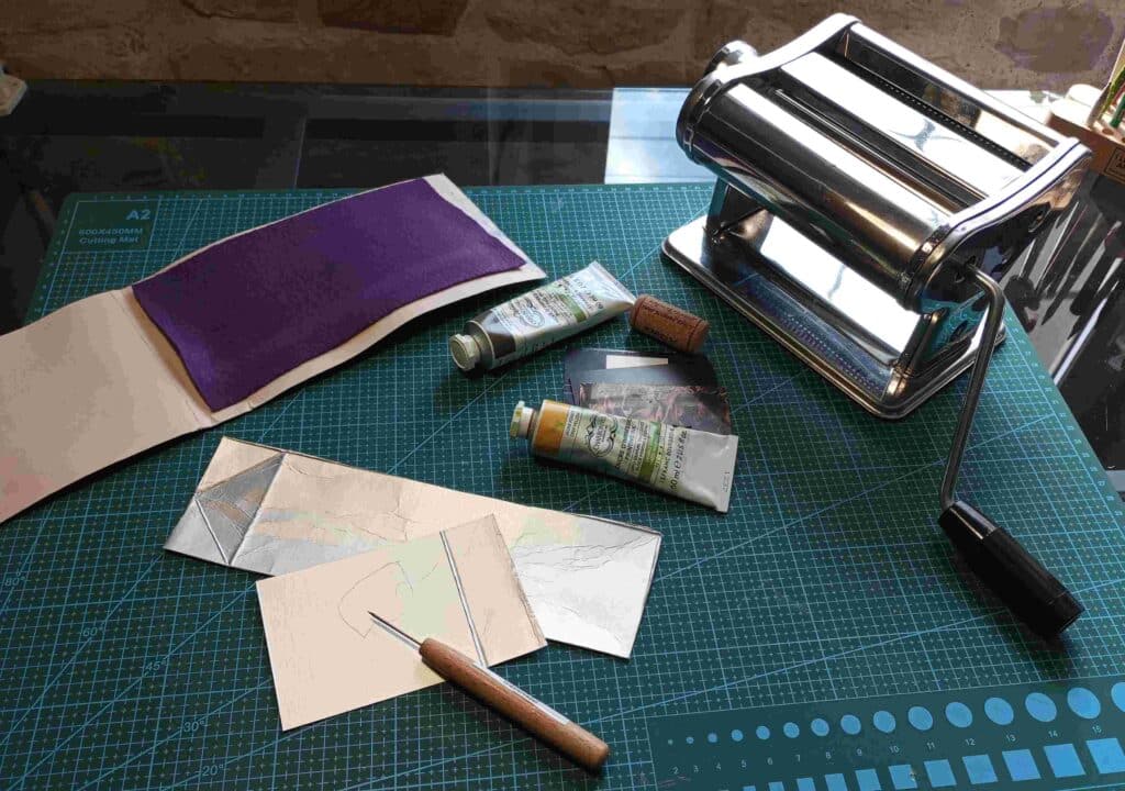 Le “millefeuille” à passer dans la presse : j’utilise un bout de pochette cartonnée pliée en deux et une bande de feutrine. Vérifiez que la largeur passe dans le laminoir.