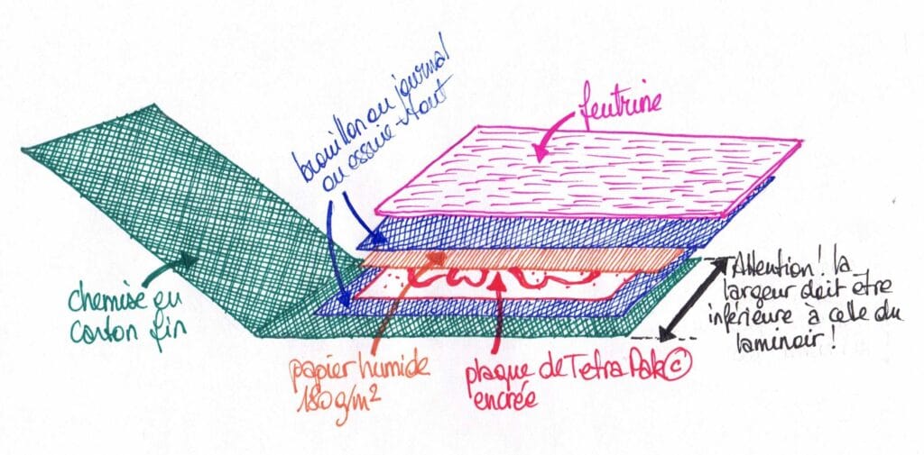 Construisez votre millefeuille : dans la pochette ouverte, mettez une couche de brouillon, votre plaque encrée (face encrée vers le haut), le papier humide, éventuellement une feuille d’essuie-tout, la feutrine, puis refermez la pochette.