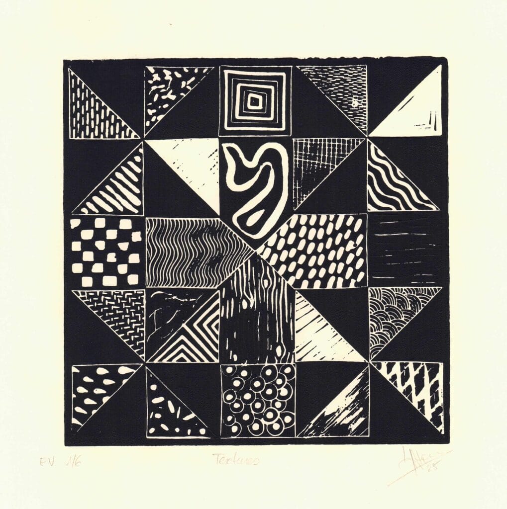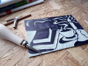 Connaissez-vous cette technique ? Il s’agit de graver une plaque de linoleum (pas celui que l’on pose au sol !), puis de l’encrer et d’appliquer le support dessus, au moyen d’une presse ou d’un petit pressoir manuel (baren). Le motif encré se reporte sur le support et on obtient une estampe.