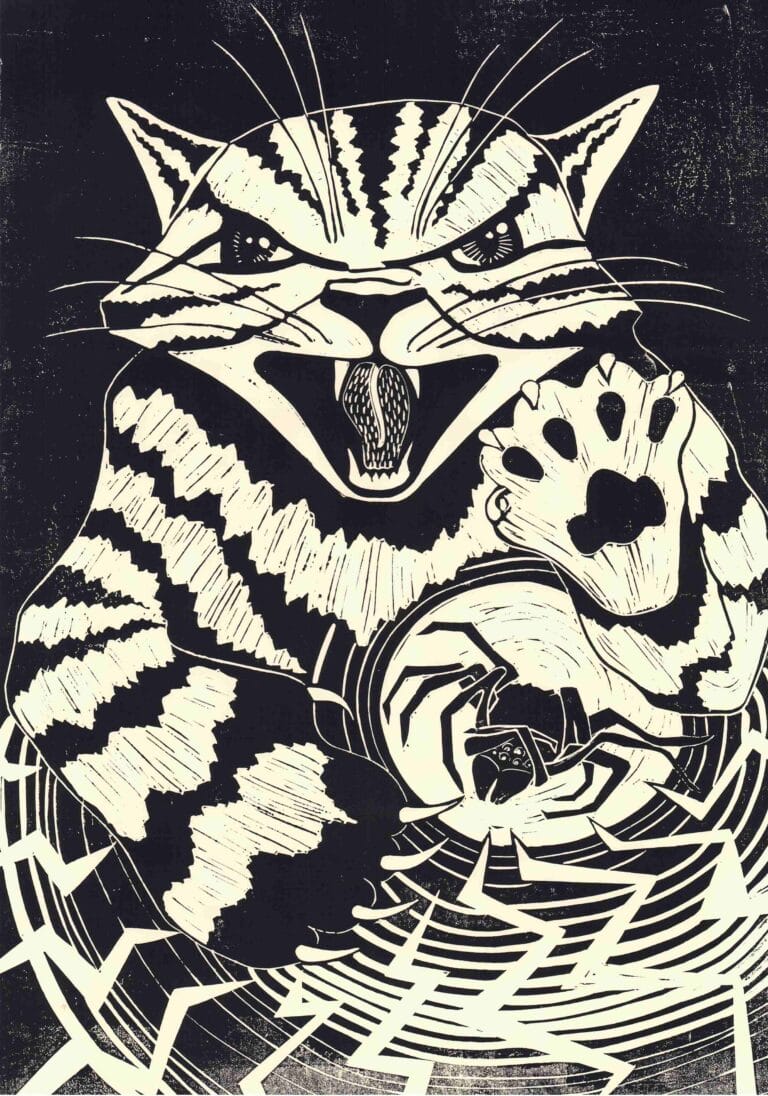 Je ne travaille que mes propres motifs, ce qui implique la conception du dessin – sans oublier de réfléchir en négatif (les traits que je creuse seront blancs sur l’estampe, en plus de l’effet miroir).